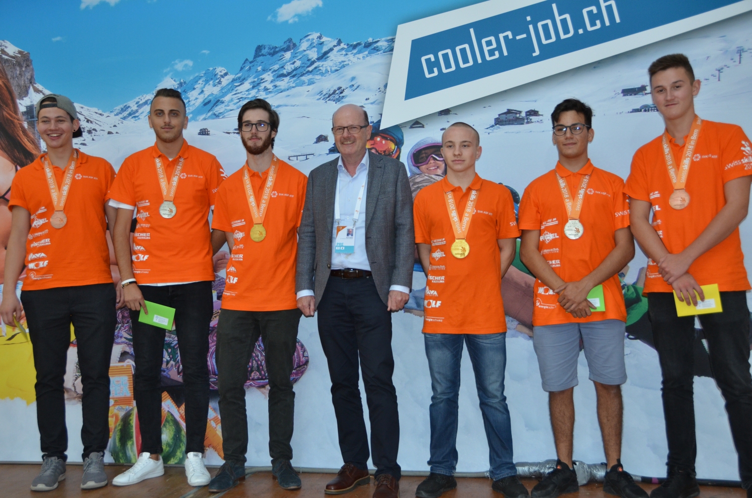 La cérémonie de remise des prix dans un cadre solennel, qui s’est déroulé samedi sur le terrain de hockey sur glace de la Finance-Arena, était une digne clôture des championnats suisses 2018, et ce non seulement pour les métiers du froid. Tous les participants aux SwissSkills 2018 peuvent se remémorer leur prestation avec fierté et joie. La célébrité et l’honneur reviennent bien sûr aux vainqueurs des médailles. Les médailles et les félicitations leur ont été remises personnellement par le Conseiller fédéral Johann Schneider-Ammann.